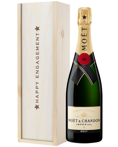 Perfect for any newly engaged couple, this Champagne set is the best engagement gift you can find. Mark the milestone and share your happiness by sending the lovebirds a single bottle of Moet & Chandon Imperial Brut to enjoy on your behalf. Beautifully presented, this gift is packaged in one of our classic wooden gift boxes, with ‘Happy Engagement’ printed on the lid, and has wood wool lining for protection and style. Make it personal with a written message to express your excitement and make it the best engagement gift they receive! Have it delivered either the next day or on a date of your choice.