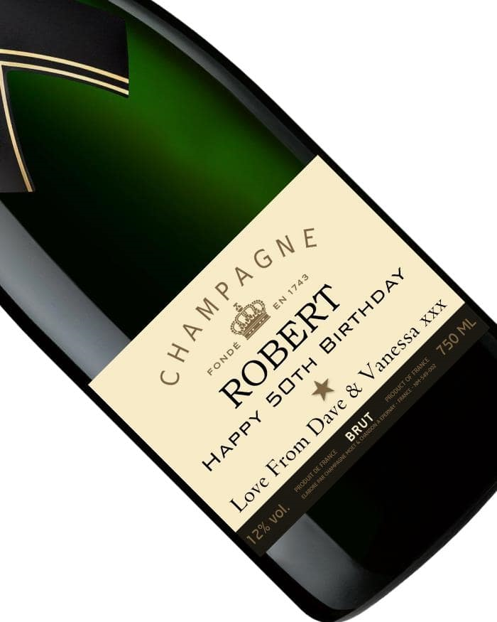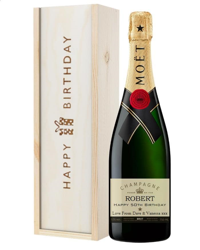 This personalised 50th Champagne birthday gift is the perfect way to send best wishes for this milestone celebration. A unique label design on a classic bottle of Moet & Chandon Brut Imperial Champagne. Delivered on the date of your choice and packaged in a solid wooden box with the words ‘Happy Birthday’ printed on the lid. This gift box will bring a smile to anyone who receives it from Mum, Dad, Brother or Sister to your best friend or work colleague. With the option to add a personal greeting card message which gets included in the box and a further option when checking out to add a little fun on arrival with an add-on helium balloon.