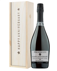A unique gift box that features a single bottle of Prosecco with a personalised label; if you’ve been searching for a one-of-a-kind anniversary gift, this truly remarkably gift set offers everything you want, and so much more. Make it personal by adding your own words to the label. This gift is presented in one of our classic wooden gift boxes with ‘Happy Anniversary’ printed on the lid and is protected with wood wool lining. Easy to personalise with a message from you as well if desired, this amazing gift box makes any anniversary as great as it can possibly be. Have it delivered anywhere in the UK with next day or selected date delivery.